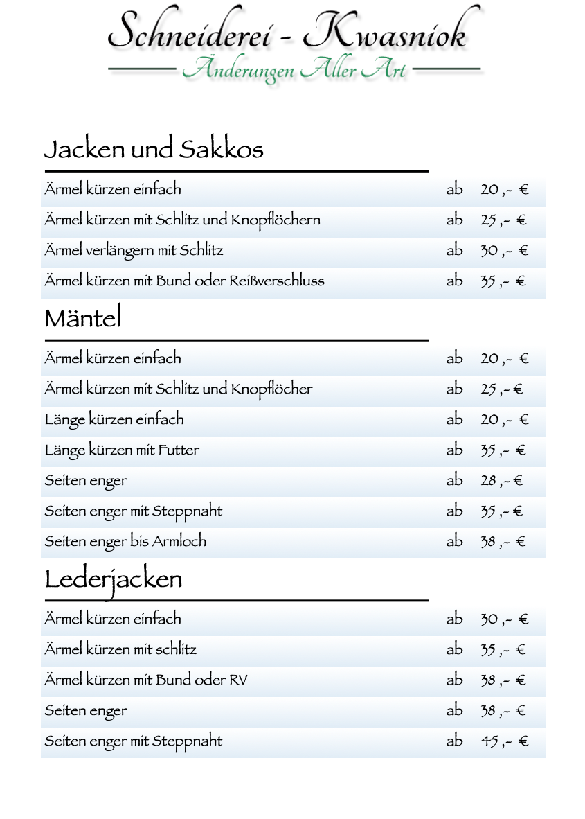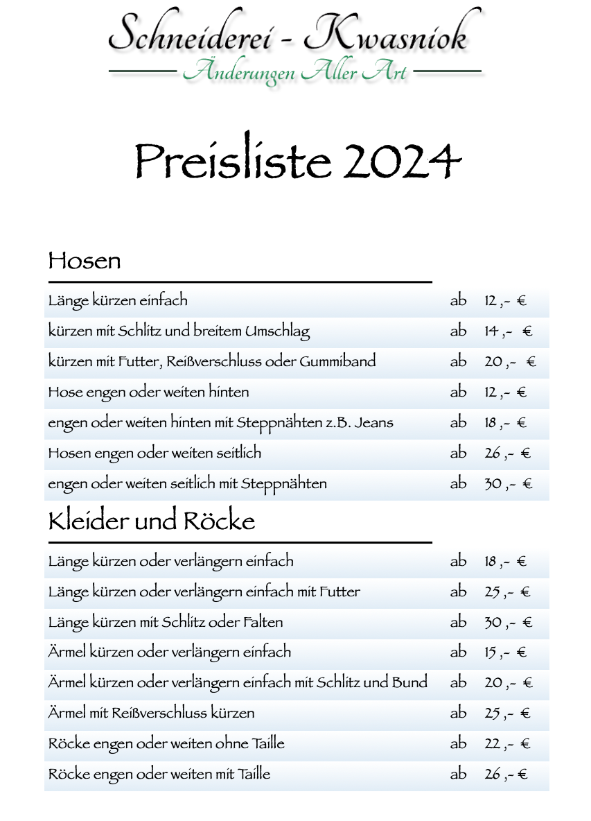 Willkommen bei der Schneiderei-Kwasniok! Hier finden Sie unsere aktuelle Preisliste für Nähdienste. Unser Ziel ist es, Ihnen individuelle Lösungen anzubieten, die Ihren Bedürfnissen entsprechen. Egal, ob Sie ein einzigartiges Kleidungsstück oder Anpassungen an bestehenden Kleidungsstücken wünschen, wir sind hier, um Ihnen zu helfen. Kontaktieren Sie uns für weitere Informationen oder um einen Termin zu vereinbaren. Tel:. 0241 33180